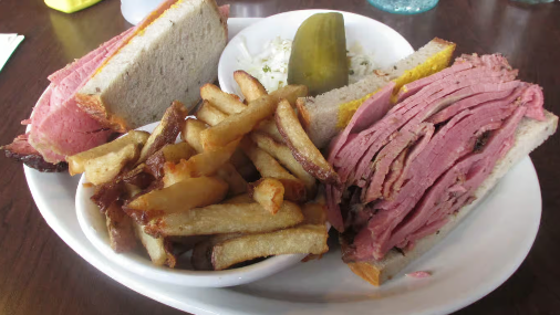 Servi avec ½ livre de viande fumée frites, salade de chou et cornichon. / Served with ½ pound smoked meat, French fries, coleslaw and pickles.