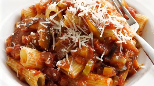 Recette authentique de Calabria, aubergines, ail, poivrons, tomates, basilic et pancetta. / Authentic calabrese recipe, eggplants, red pepper, tomatoes and pancetta.