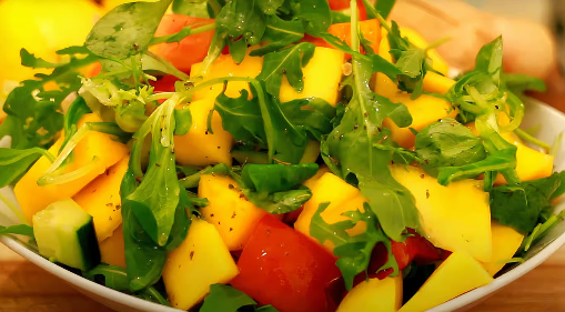 A mix of fresh greens, ripe tomatoes, and crisp cucumbers, dressed lightly with a vinaigrette.
